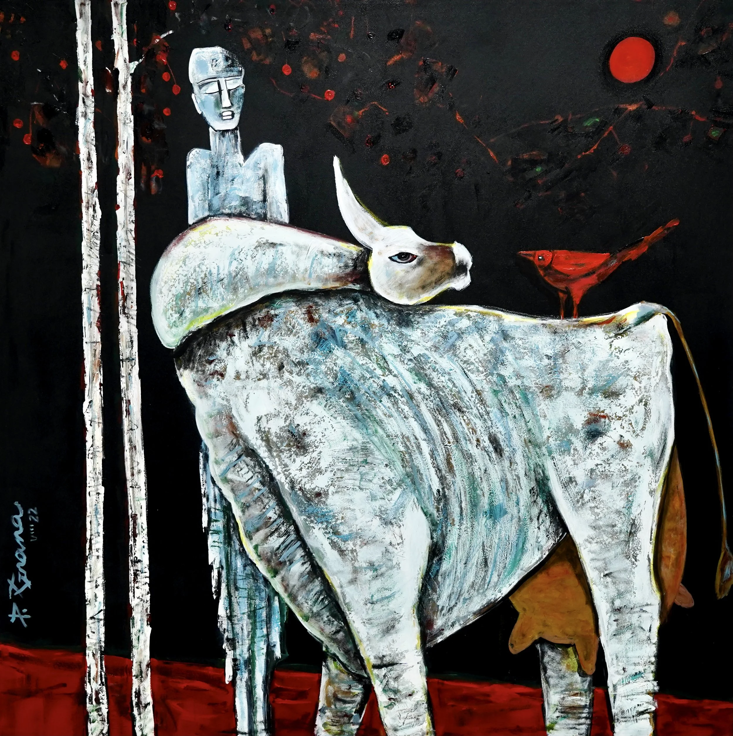 Dr Gnana painted his first cow in 2007 and continues exploring it as a subject to date. No two paintings are the same, and in this difference lies the unfolding of the meaning. Sometimes the form is vibrant, sometimes solemn, sometimes monumental in scale, other times intimate and lyrical. Through shifts in colour, composition, and gesture, Dr Gnana resists stagnation, reminding us that even with sameness, there is endless possibility.
